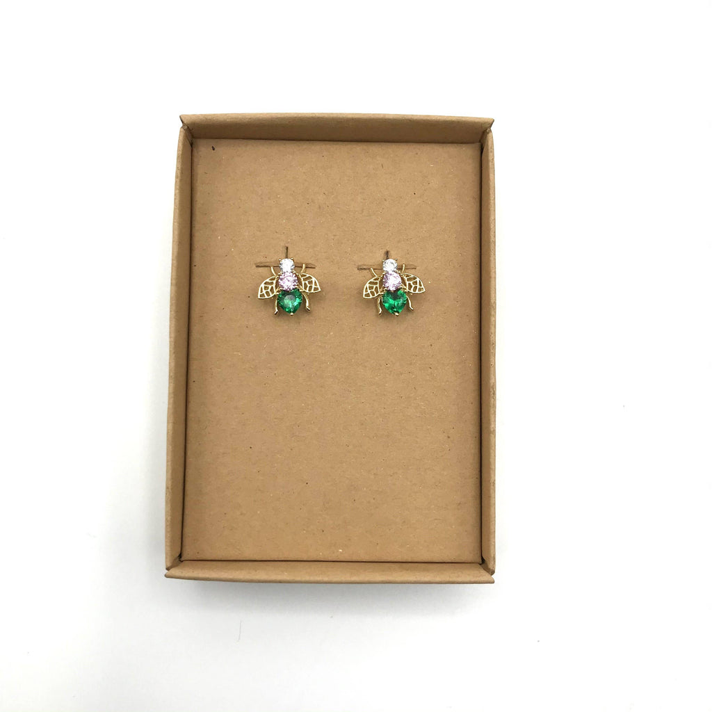 A pair of delicate bee earrings featuring 3 coloured jewels.